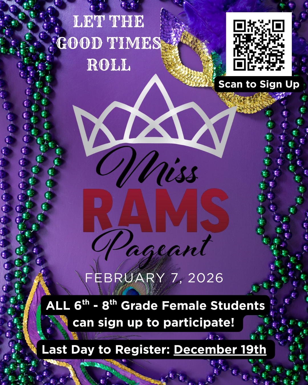 RAMS Pageant It's time to begin thinking about the Miss RAMS Pageant! Sign-ups are due by Dec 19th. All female students are eligible to register.