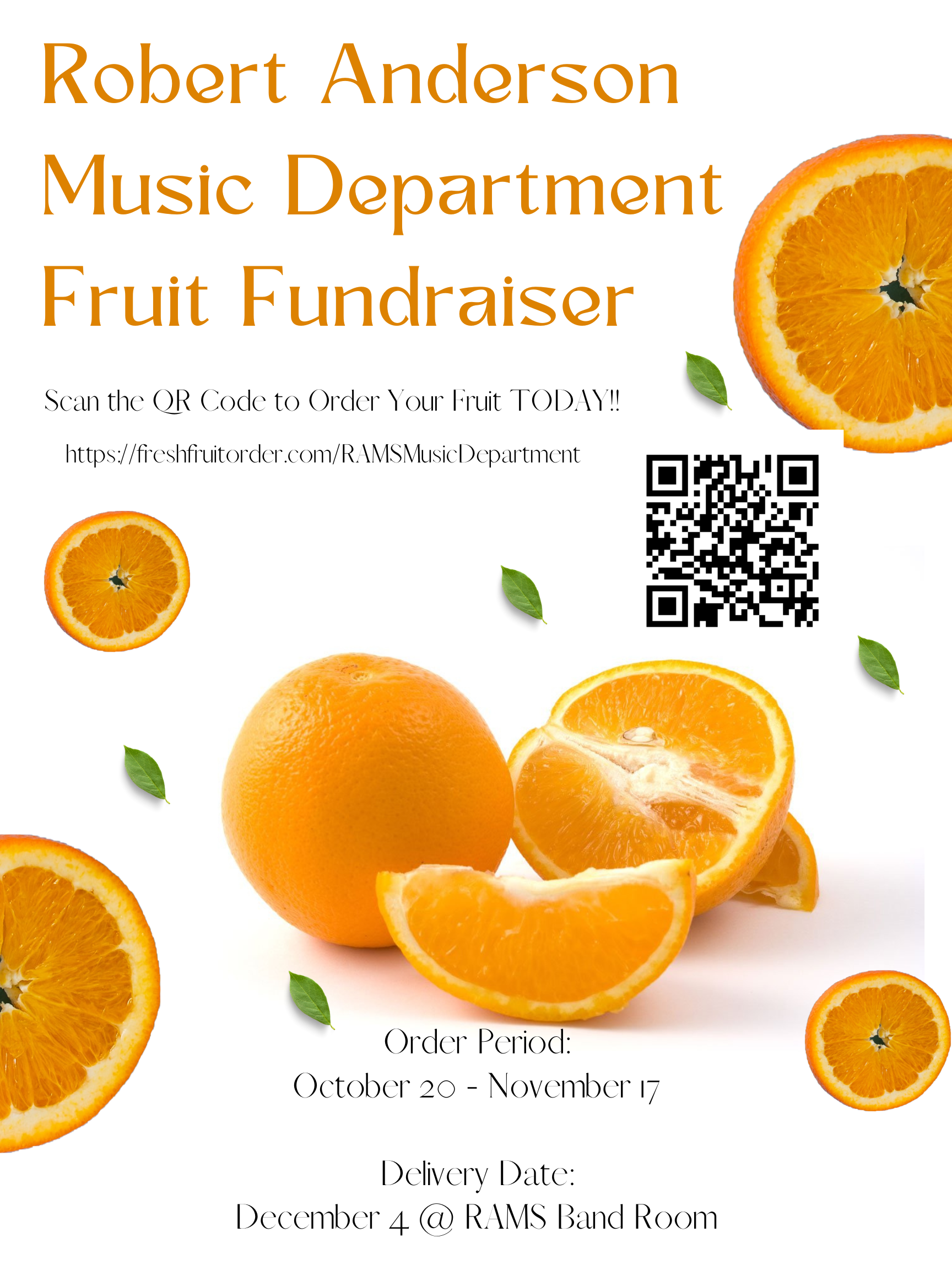 Fruit Fundraiser Support the RAMS Music Department by ordering fruit at https://freshfruitorder.org/RAMSMusicDepartment.Fruit will be delivered to the RAMS Band room on December 4th.